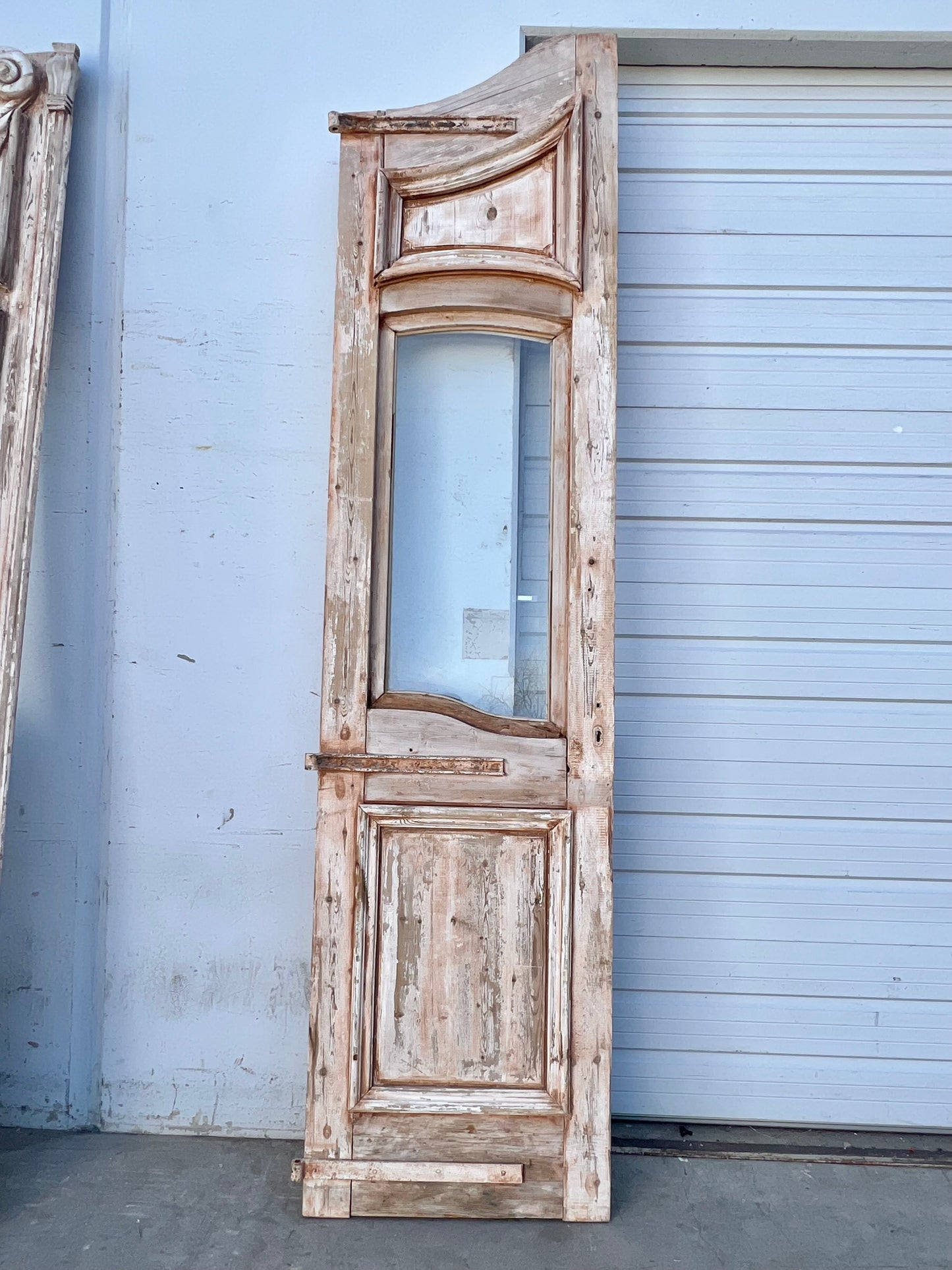 Pair of Washed Antique Wood Arched Single Lite Carved Doors with Raised Panels