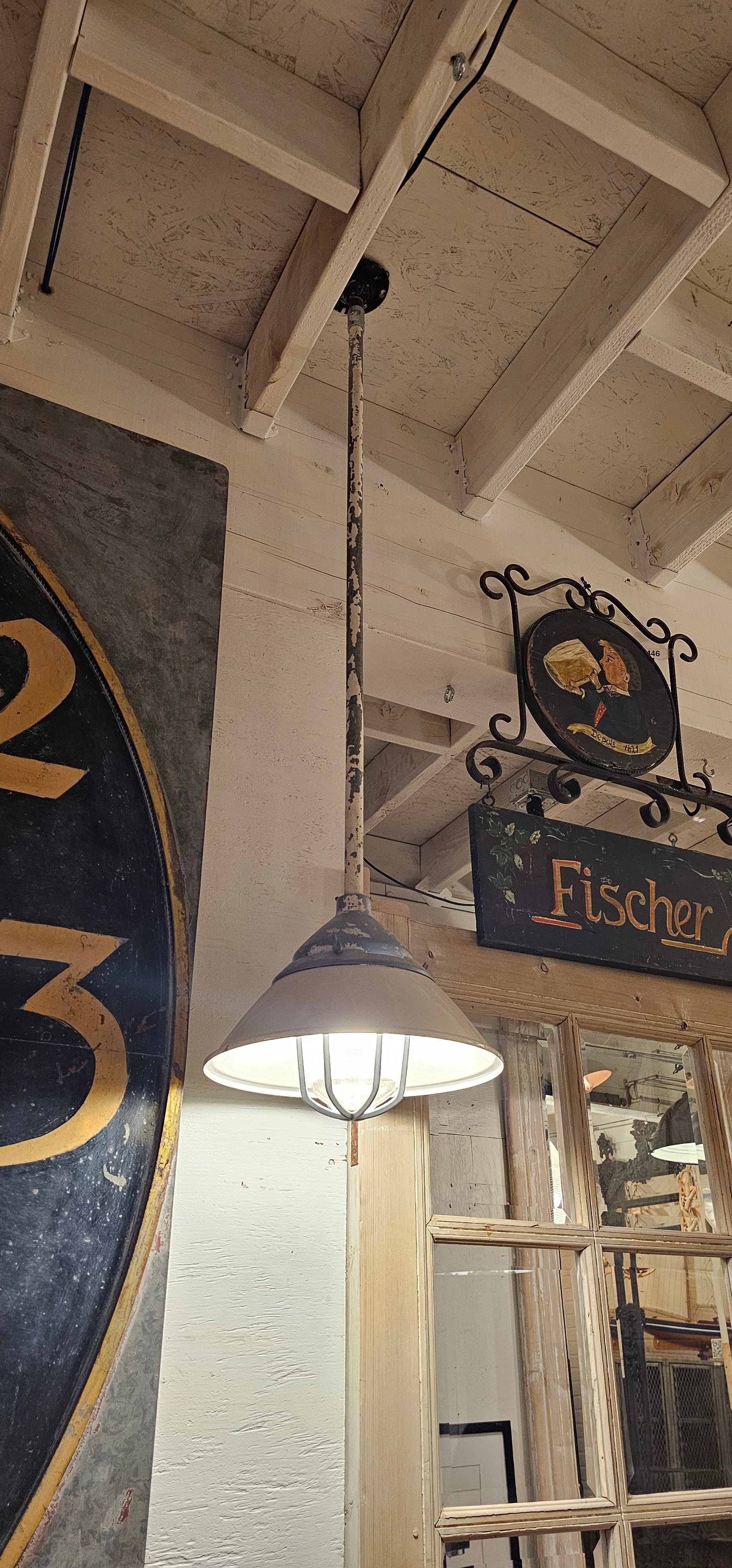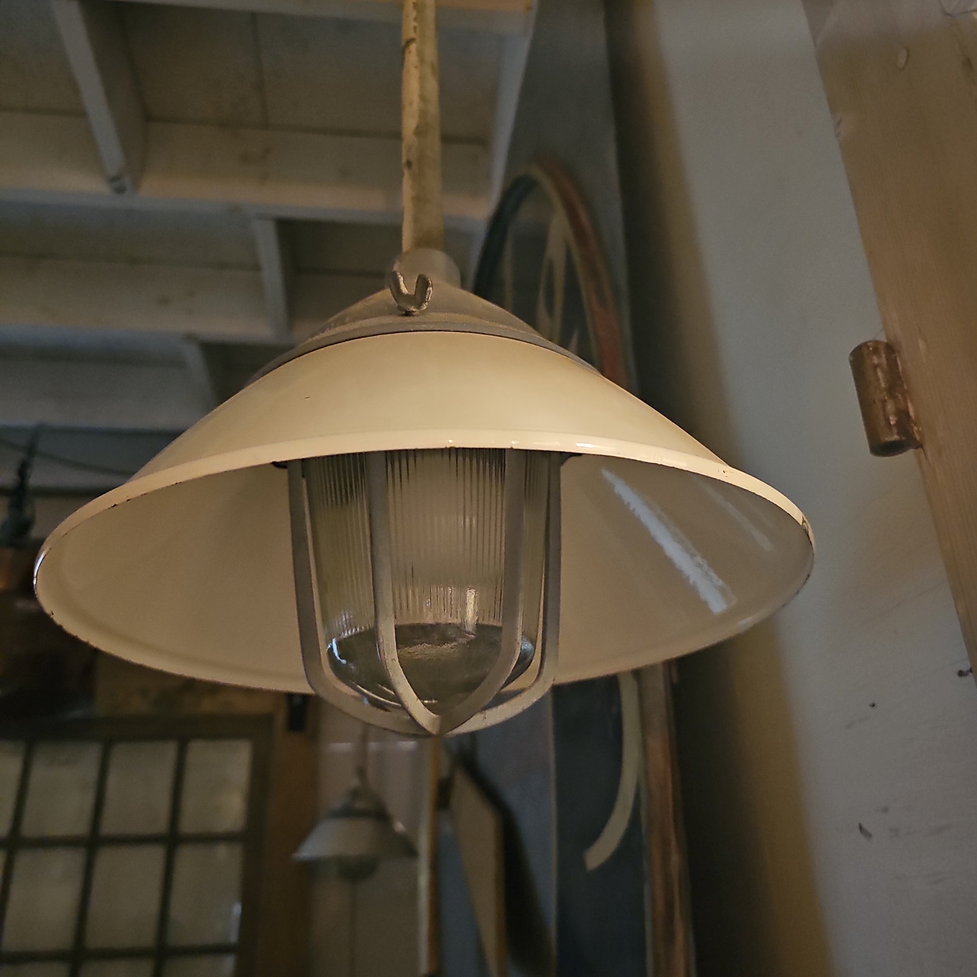 White Enamel Pendant Light with Galvanized Cage